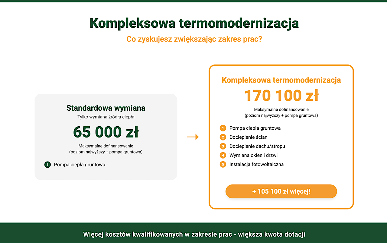 Dofinansowanie zwiększa się dzięki dobrze dobranemu wariantowi prac, który spełnia wymagany standard energetyczny i mieści się w kosztach kwalifikowanych oraz limitach programu.