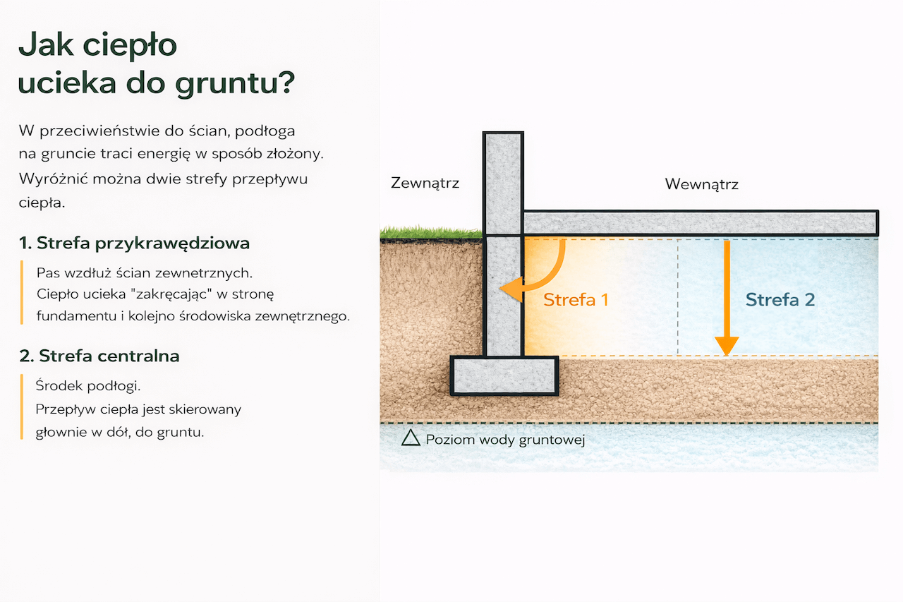 - Strefa centralna: to pozostała część powierzchni podłogi, w której przepływ ciepła następuje głównie przez warstwy podłogi do gruntu.