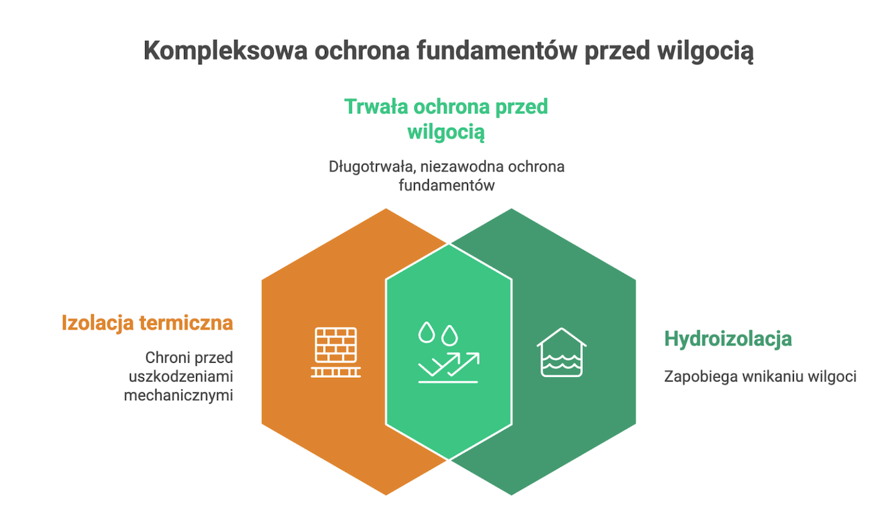 Prawidłowo wykonana izolacja termiczna fundamentów pełni często podwójną, niezwykle ważną rolę, ponieważ jest nierozerwalnie związana z systemem hydroizolacji. Termoizolacja, montowana po zewnętrznej stronie ściany fundamentowej, stanowi mechaniczną osłonę dla warstwy przeciwwilgociowej lub przeciwwodnej. Chroni ją przed uszkodzeniami (np. podczas zasypywania wykopów), co gwarantuje jej szczelność na lata.