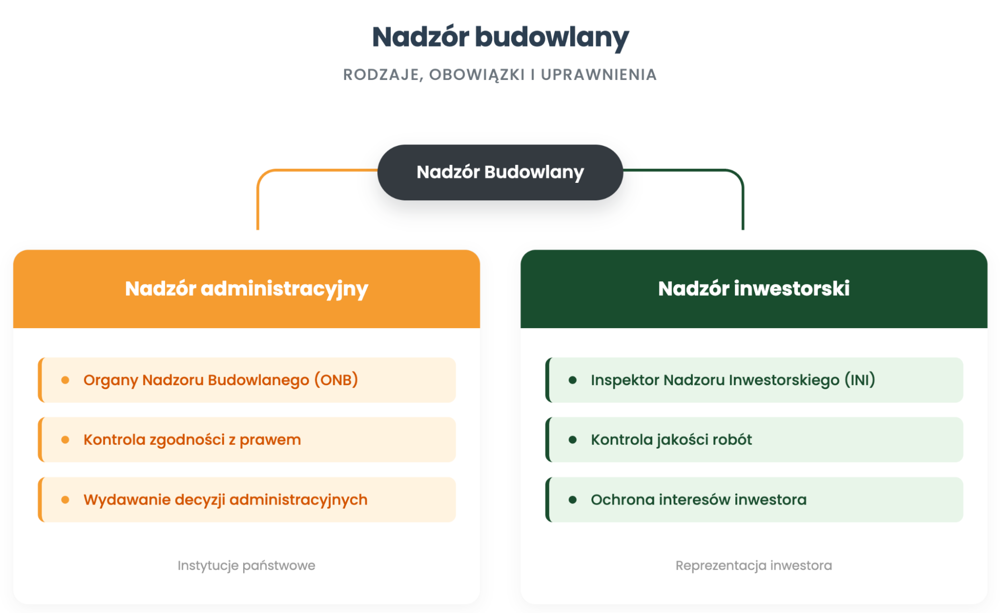 Punktem wyjścia do zrozumienia systemu kontroli w budownictwie jest rozróżnienie dwóch niezależnych od siebie form nadzoru. Pierwszą jest nadzór administracyjny, realizowany przez Organy Nadzoru Budowlanego (ONB), natomiast drugą – nadzór inwestorski, sprawowany przez Inspektora Nadzoru Inwestorskiego (INI) na zlecenie inwestora. Pomimo że oba podmioty działają na podstawie Prawa budowlanego, ich cele i zakres odpowiedzialności są odmienne.