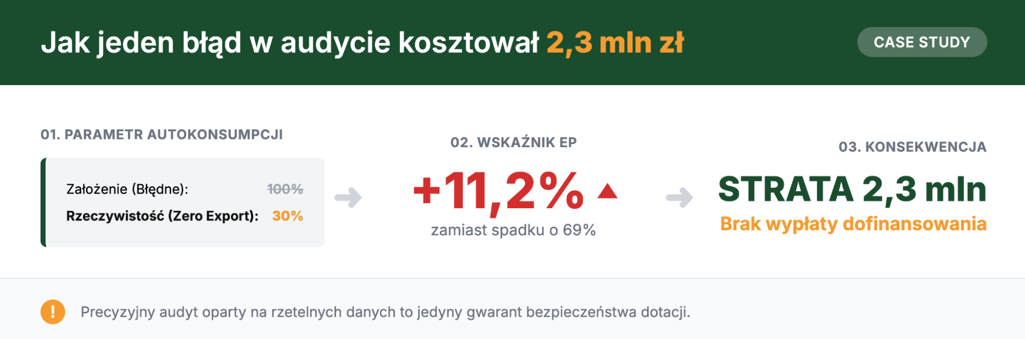 Wnioski płynące z powyższego zestawienia są jednoznaczne. W wariancie realistycznym wskaźnik EP zamiast spaść o wymagane 20%, wzrósł o ponad 11%. Oznacza to brak spełnienia minimalnego wymogu redukcji EP, brak kwalifikowalności kosztów oraz konieczność zwrotu całości dofinansowania.