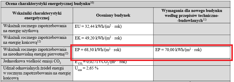 - Wskaźnik rocznego zapotrzebowania na nieodnawialną energię pierwotną (EP) – informujący o wpływie budynku na środowisko naturalne i zużycie nieodnawialnych surowców.