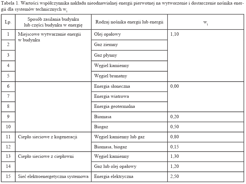 Wartości współczynnika nakładu nieodnawialnej energii pierwotnej zawarte w Dz.U. 2023 poz. 697.