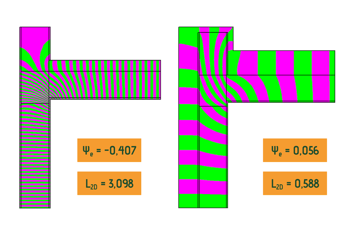 Rysunek 2. Rozkład strumieni ciepła oraz wartości liniowego współczynnika przenikania ciepła dla mostka cieplnego przed (po lewej) oraz po termomodernizacji (po prawej).