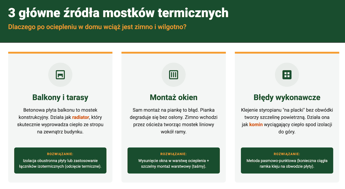 Szczegółowe wyjaśnienie mechanizmów ich powstawania oraz wpływu geometrii budynku na ucieczkę ciepła znajdziesz w artykule: Mostki cieplne – Co to jest, jak powstają i jak je eliminować?
