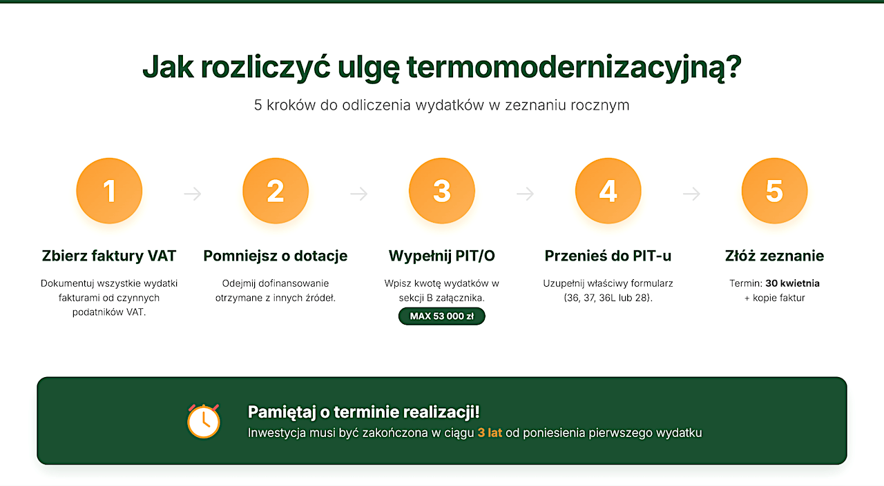 Rozliczenie ulgi termomodernizacyjnej następuje w rocznym zeznaniu podatkowym (PIT-36, PIT-37, PIT-36L lub PIT-28) poprzez wypełnienie załącznika PIT/O.